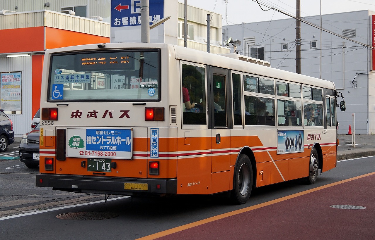 2558号車は、沼南営業所に所属している2002年式の7E架装のKL-LV280L1です。この2558号車より、コスト削減のためサッシの無塗装化や後部換気扇の省略などが行われたため、前年度投入車とまた違った印象となっています。また、”東武バス”表記の無塗装サッシ車は、東武バスグループ全体でもこの2558号車1台のみであり異彩を放っています。