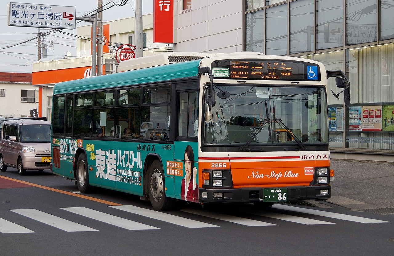 2866号車は、沼南営業所所属の2012年式(LKG-LV234L3)のエルガです。東武バスグループの路線車では、2012年式より車体の社名表記が”東武”から2002年式以前と同様の”東武バス”表記へと変更され、”東武バス”表記のエルガが初お目見えしました。この2866号車と僚車の2865号車と共に東武バスイースト初の”東武バス”表記のエルガとなりました。また、翌年の投入車よりQPG代の車両となったため、東武バスイースト管内のLKG代の”東武バス”表記の車両はこの2866号車と僚車の2865号車の2台のみとなりました。