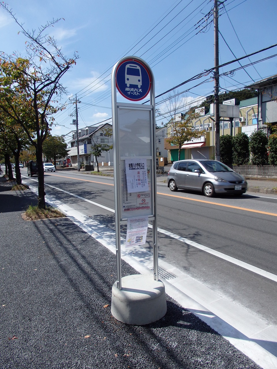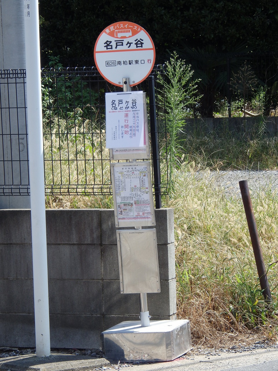 新柏四丁目の次は、既存区間の名戸ヶ谷バス停です。写真は、新設された新柏駅方向のバス停です。歩道の幅の関係か、小型のものが設置されていました。