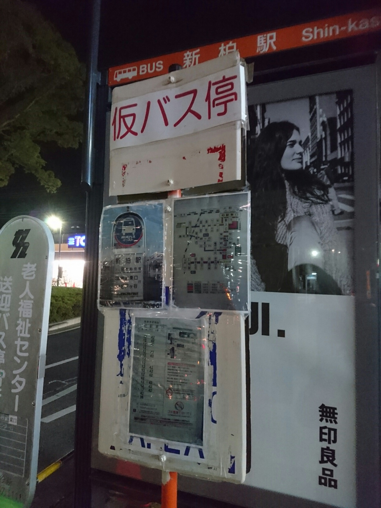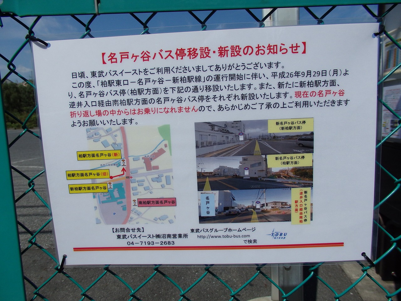 現在の名戸ヶ谷バス停に掲示されていたバス停移設のお知らせです。この掲示にある柏駅方面の名戸ヶ谷バス停は、24日現在、設置されていませんでした。