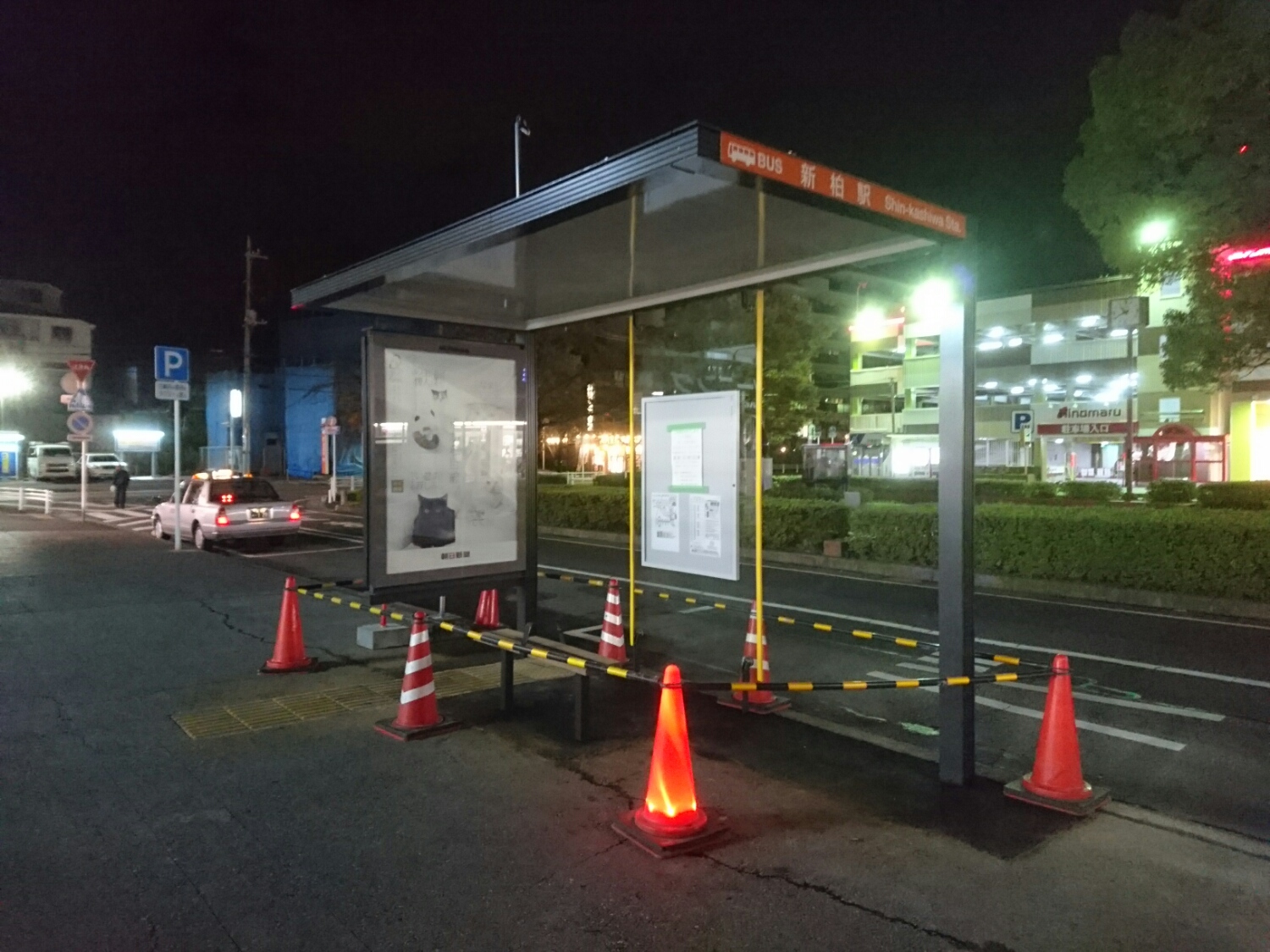 反対側の新柏駅方向のバス停は、時刻表や路線図などは設置されていたものの、バス停名などを表示したものは設置されていませんでした。
